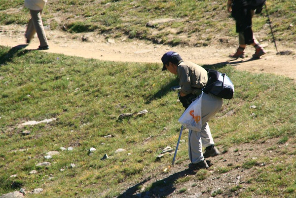 前方的日本阿伯沿路撿拾垃圾,非常有心