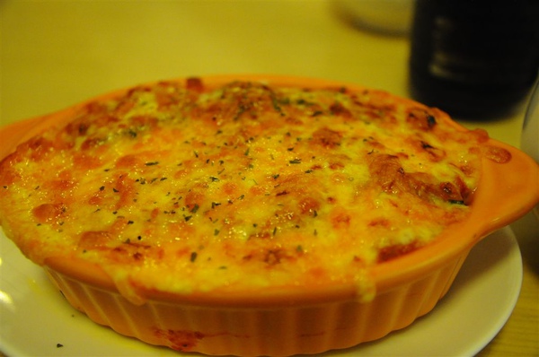 小李點了義大利肉醬飯焗烤,跟我的南瓜培根焗烤一樣的問題,料是料,白飯是白飯,要先自己拌一下。