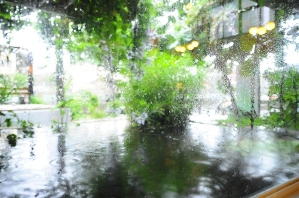 今天大雨滂沱,原本玻璃窗位置應該可以面對水塘,今天卻只能面對朦朧的玻璃