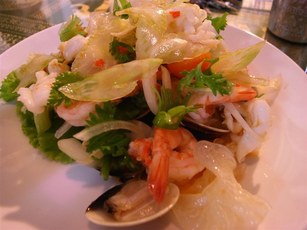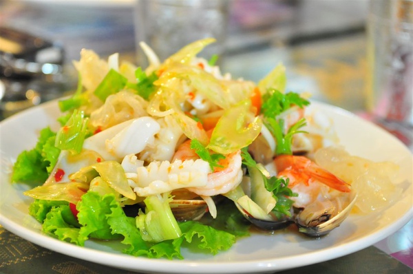 涼拌海鮮沙拉,我吃到花枝,很有嚼勁。口味偏酸很開胃,但是菜都快吃完了才上,這時候開胃有點慢啦~