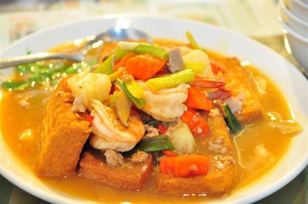 鮮蝦豆腐(需預定),海鮮類當然都很新鮮,襯底的豆腐是我喜歡的老皮嫩肉,炸過的雞蛋豆腐吸入飽滿的湯汁,好好吃啊~馬鈴薯、紅蘿蔔也很入味,馬上被一掃而空(不過我們幾乎每道菜都一掃而空啦~)