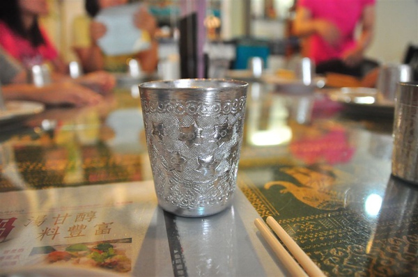 我們的座位上已經放好錫杯,用這種杯子裝水會格外冰涼,適合炎熱的夏天