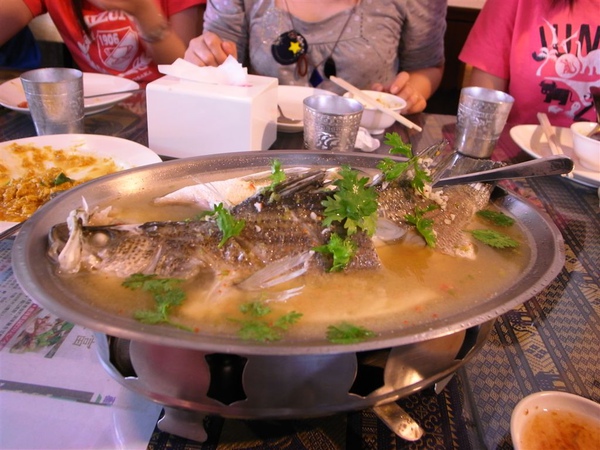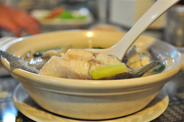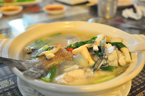 塔香鮮魚湯 (需預定),湯頭酸酸的很好喝,而且越下面的湯越酸越開胃,我喝了好幾碗湯。除了鱸魚外,湯裡還有菇類、番茄等等蔬菜