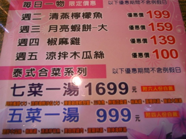 桌上有特價菜單,我們點了七菜一湯的合菜再另外單點很多菜,全部菜單大概一半以上我們都吃過了吧