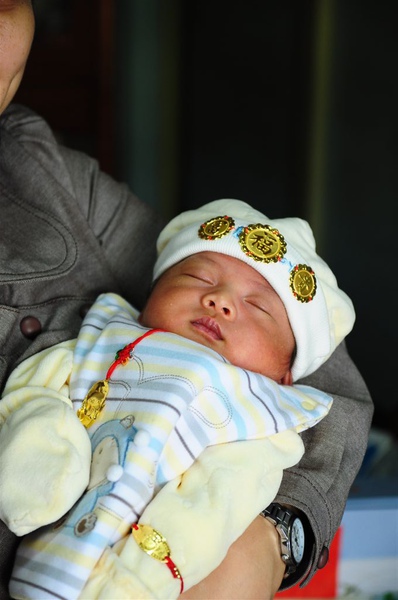 滿月當天外婆讓我穿新衣、戴新帽,還穿金戴銀耶~可是舅舅笑我福祿壽...