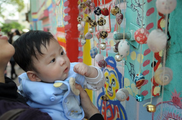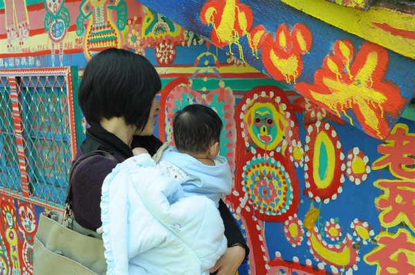 第一個目的地是「彩虹眷村」,小果本來還在哭,我趕緊抱他到牆壁邊指著鮮豔的圖畫讓他看
