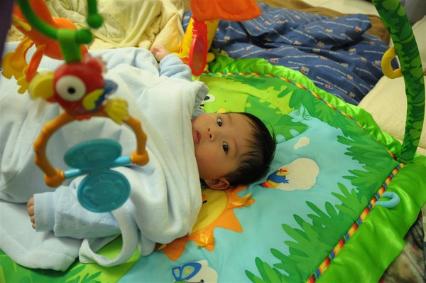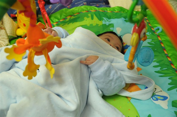 剛剛他老爸把他放回小床,打開床頭音樂鈴要讓他睡覺,他還給老爸一個天使的微笑,