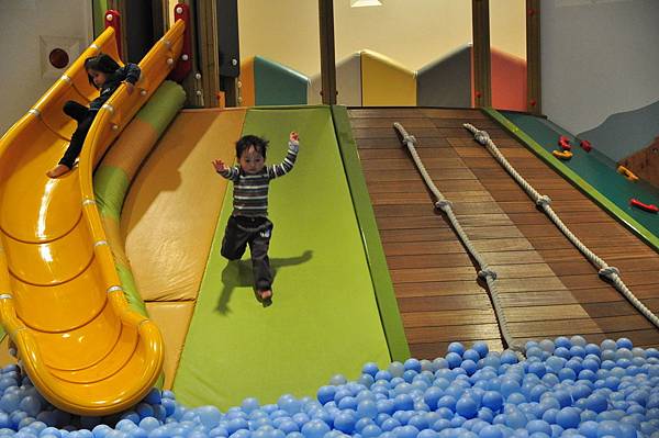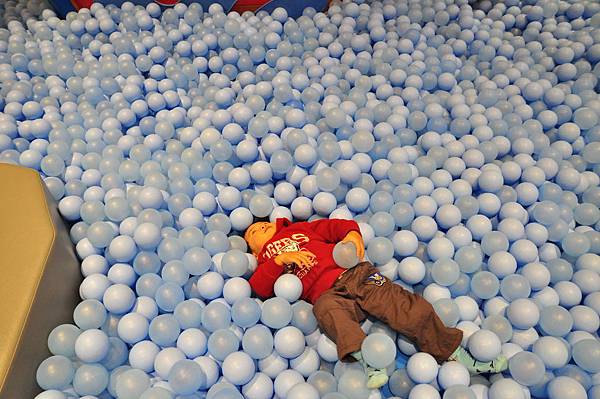 想當然耳,小恩第一個就往球池衝,爬上溜滑梯滑到球池整個人在裡面滾