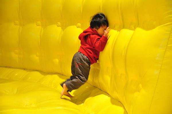 最近很愛跳跳跳的小恩看到這個充氣床如獲至寶,在裡面跳到滿頭大汗,摔到了滾一圈哈哈大笑爬起來繼續跳,最愛的竟然是跳到牆壁邊撞牆,跌倒後走到中間繼續跳去撞牆