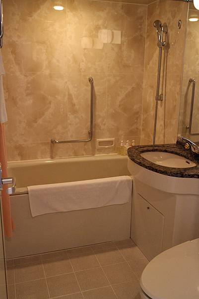 右手邊有浴室和梳妝台,浴室該有的備品一樣不少。梳妝台獨立在浴室外的空間,但我沒拍到照片。