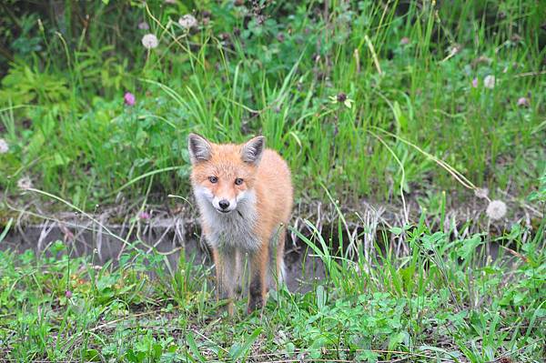 到二世谷的半路山上大霧瀰漫,突然間路邊出現一隻小狐狸。司機眼睛也太好,竟然看到狐狸,我們停在路邊,靜候一會還拿出餅乾引誘,終於拍到這麼近的照片,這也是一路上我們唯一一次這麼近距離拍到野生動物