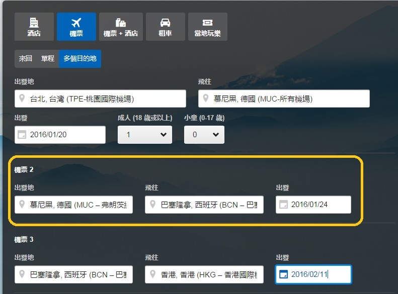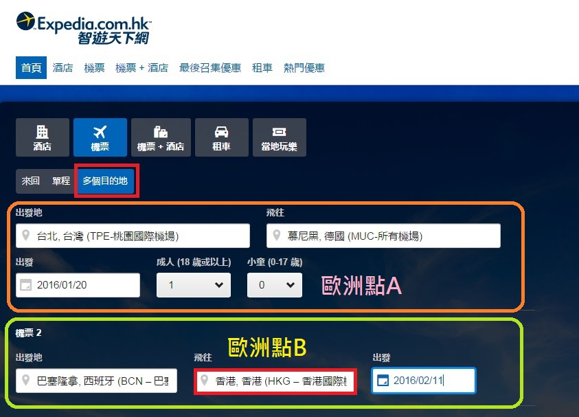 購票要從Expedia香港網站進入,選擇「多個目的地」
