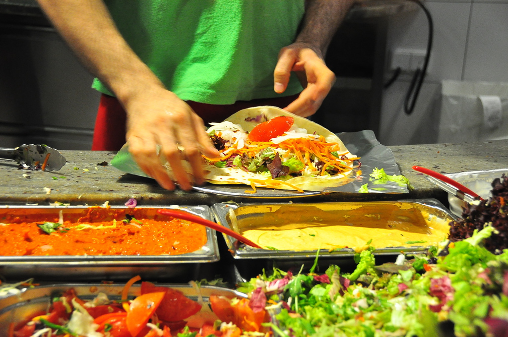 於是我們決定試試看。現烤餅皮,加上優格醬料(還有咖哩等共3種口味)和大量蔬菜、不過鹹的烤肉,真的好好吃啊!
