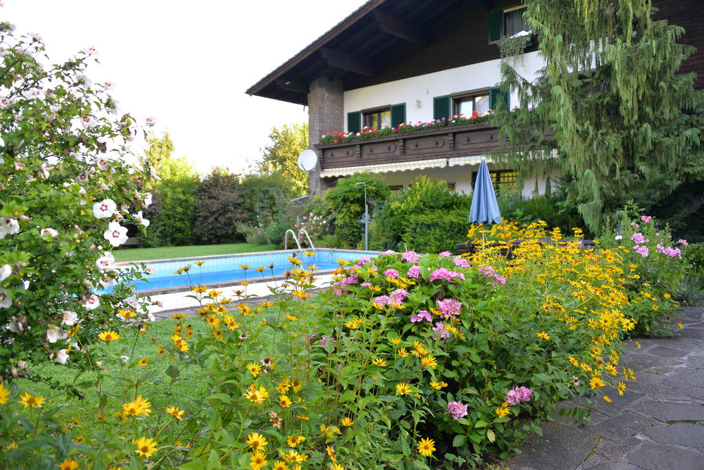 主建築花木扶疏,還有游泳池呢!不過八月中已經有點冷,我們已經穿上長袖,根本不想碰水...